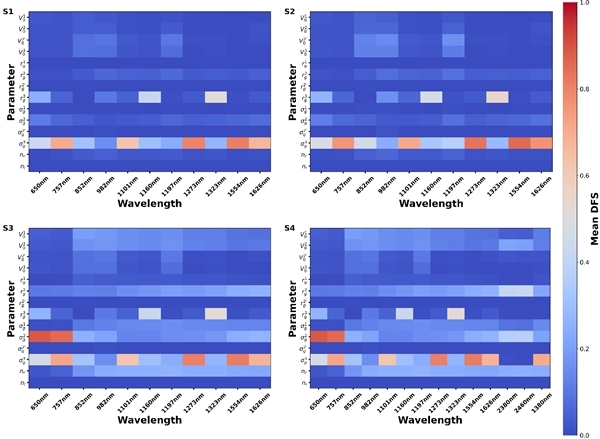 在观测场景 S1–S4 下,各参数的平均 DFS 与波长 (650nm–2460nm) 的关系